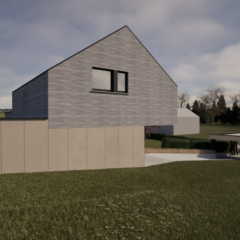 Ce projet s’articule autour de deux volumes clairement affirmés : l’habitation et son carport. Bien que distincts, ils dialoguent à travers un langage architectural commun, exprimé par une écriture contemporaine et une palette de matériaux soigneusement coordonnée.